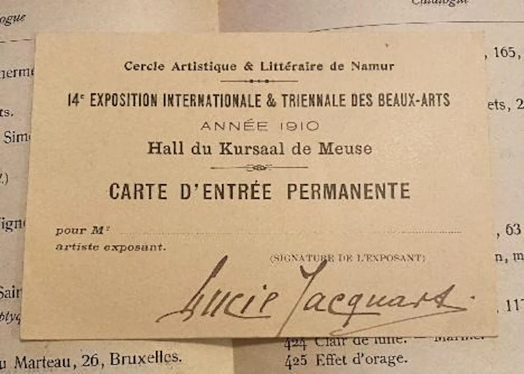 Foto Elisabeth Vissitch, 12/12/2025, Galerie St.- John. Permanente toegangskaart van Lucie Jacquart voor de 14De internationale en triënnale salon, 1910.